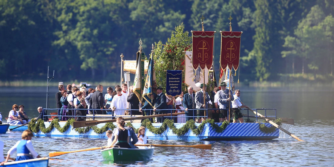 The procession in Seehausen, however, is unique throughout Bavaria. It takes place not only in the festively decorated village streets, but also on the Staffelsee. With dozens of boats, clergy and faithful cross over to Wörth Island, where the roots of the Seehausen parish lie there at the chapel.