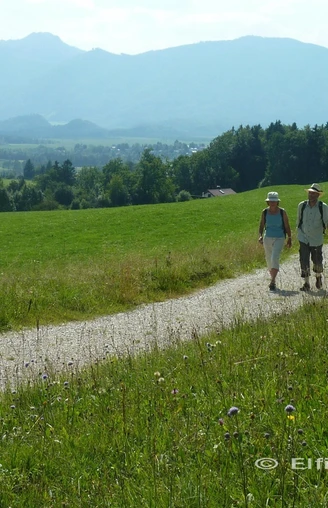 Wir gehen auf der Aidlinger Dorfstraße weiter und biegen bei der nächsten Kurve links in die Lohwiesstraße ab. Wir bleiben auf dieser Straße, die schon bald aus Aidling herausführt. Vor uns haben wir nun das sanft hügelige Alpenvorland, teils Weideland, teils bewaldet und im Hintergrund die Alpenkette. Wir folgen dem Sträßchen, gehen bei der ersten Gabelung geradeaus weiter, bei der nächsten rechts bergab und kommen schließlich beim „Haus des Gastes“ in Riegsee wieder auf die Dorfstraße. Wir gehen links und passieren den Gasthof Westner (Ruhetag dienstags von Mai bis September, Montag und Dienstag von Oktober bis April), Tel. 0 88 41 / 9 06 73, www.gasthof-westner.de.