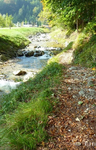 Wir folgen ihr, bis sie sich gabelt, und gehen rechts. Kurz darauf kommen wir an die Ettaler Straße, die wir überqueren (Vorsicht, Verkehr!) und folgen nun dem Wegweiser „Alte Ettaler Straße“. Wir halten uns zuerst links und dann wieder rechts. Der Weg windet sich als Pfad neben dem Bach entlang und wird schließlich schmäler. Wo er aufhört, führt ein Steg über den Bach, auf der anderen Seite gehen wir nach rechts auf einem Kiesweg weiter. Schon kurze Zeit später überqueren wir den Bach noch einmal und befinden uns nun auf der „Alten Ettaler Straße“. Diese führt bei der nächsten Weggabelung rechts, wir aber folgen dem linken Weg. Er führt uns noch ein Stück am Bach entlang und schon bald biegt die „Kienbergstraße“, dieser älteste Saumpfad und Weg, rechts ab. Am Beginn dieser ältesten Verbindung zwischen Oberau und Ettal erwartet uns eine Stele. Bei Neuschnee im Winter kann es sein, dass die „Kienbergstraße“ nicht gespurt ist, dann nehmen wir besser die „Alte Ettaler Straße“.