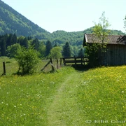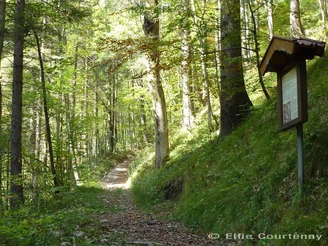 Die Kienbergstraße führt durch den Wald bergauf und lässt erahnen, wie mühselig und gefährlich der Transport mit Lasttieren und Fuhrwerken hier einst war. Schließlich mündet der Weg in die „Alte Ettaler Straße“. Wir folgen ihr und gelangen an die neue Ettaler Bergstraße, die wir überqueren müssen (Vorsicht, Verkehr!). Gegenüber nehmen wir den Kiesweg und folgen ihm bergauf. Wir treffen auf alte Kreuzwegstationen und einen Bildstock mit Madonna und Kind. Gleich nach den ersten Häusern von Ettal biegen wir rechts in die „Alte Bergstraße“ ab, die über einen Höhenweg bis nach Oberammergau führt. Wir treffen auf einen Waldlehrpfad, dem wir immer weiter folgen. Zwischendurch haben wir immer wieder reizvolle Ausblicke auf Ettal und die Klosteranlage. Schließlich treffen wir auf Stele Nr. 12 des Ammergauer Meditationswanderweges, der von Oberammergau nach Ettal führt. Hier schließt sich nun der Kreis, hier laufen die Wege zu guter Letzt zusammen. Bei der nächsten Weggabelung haben wir nun die Wahl, ob wir links nach Ettal abbiegen oder auf dem Höhenweg bleiben und nach Oberammergau weiter wandern. Einkehr- und Übernachtungsmöglichkeit: Klosterhotel Ludwig der Bayer (kein Ruhetag), Tel. 0 88 22/91 50, www.ludwig-der-bayer.de.
